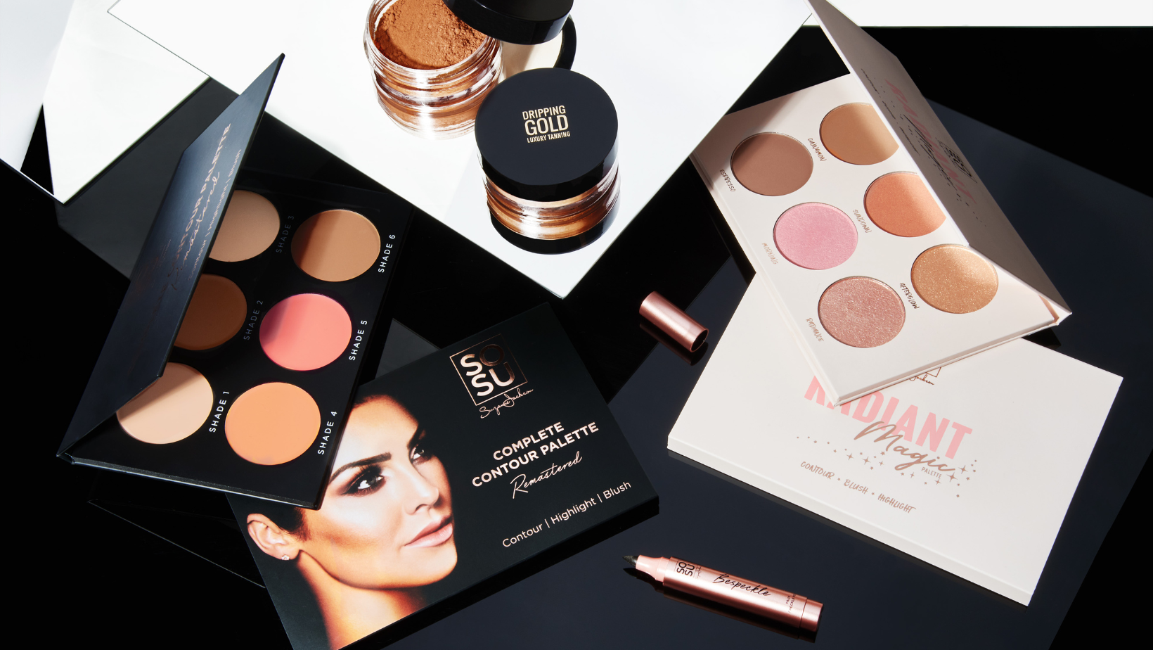 The product range includes The Complete Contour Palette, The Highlighter Kit, Luxury Lashes, The Hot Fire Signature Smoky Eye Palette, Faux nails, and most recently our first foundation, the CC Me in Foundation. SOSU Cosmetics accessories include Tweezers, Lash Glue, a Pro Blender Sponge, and a Spacious Vanity Case.